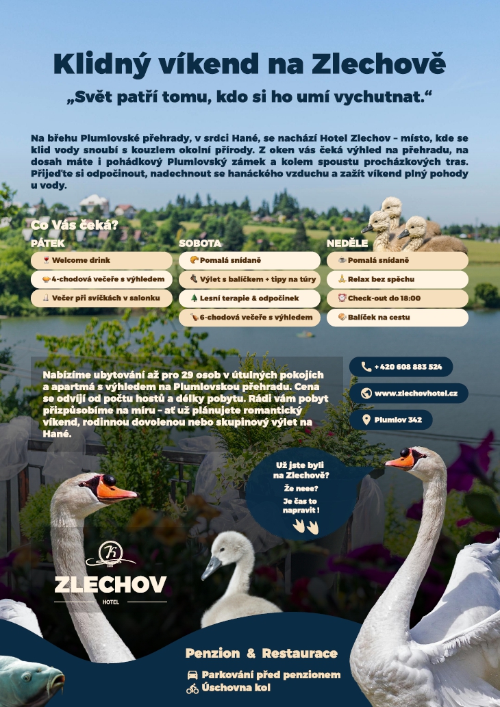 Hotel Zlechov Vás přivítá péčí, která obejme a dovolí Vám na chvíli zapomenout na čas.
