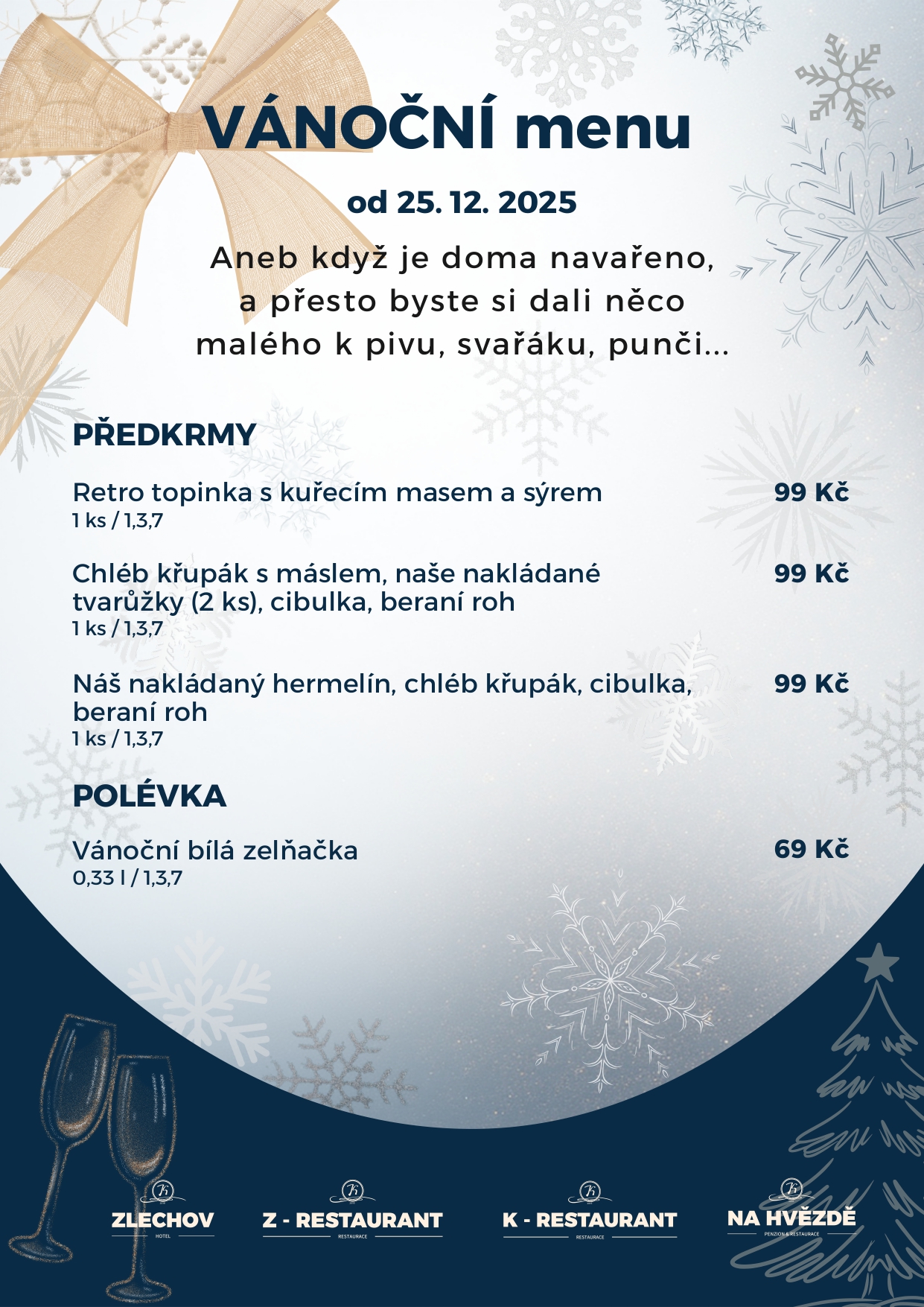 Zastavte se u nás během vánočních svátků a dopřejte si chvíli klidu, dobrého jídla a sváteční atmosféry. Přejeme Vám radostné a klidné Vánoce a s potěšením se postaráme o to, abyste si tento čas užili naplno.