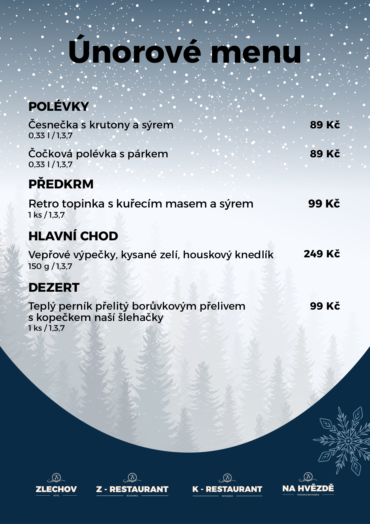Zima má své kouzlo – klid, vůni lesa a chuť poctivé kuchyně. Připravili jsme pro Vás únorové menu, které zahřeje, potěší a na chvíli Vás zpomalí. Vsadili jsme na tradiční chutě, poctivou přípravu a kombinace, které k zimnímu období prostě patří. Dopřejte si chvíli pohody a přijďte si vychutnat zimní speciality, dokud jsou na stole.