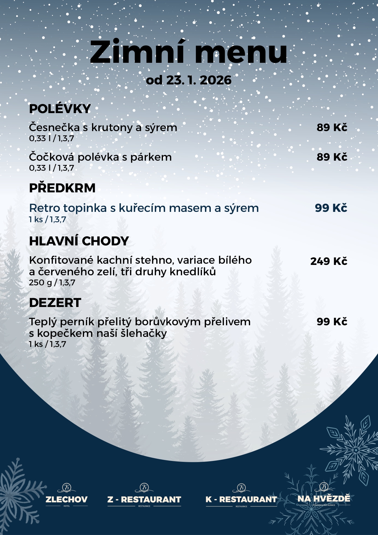 Zimní menu je tu od 23.01.2026 a pouze na omezenou dobu. Přijďte si ho vychutnat dřív, než se po něm zapráší a zima se s námi rozloučí. Těšíme se na vaši návštěvu a věříme, že u nás najdete přesně to, co k zimní pohodě patří. ❄️