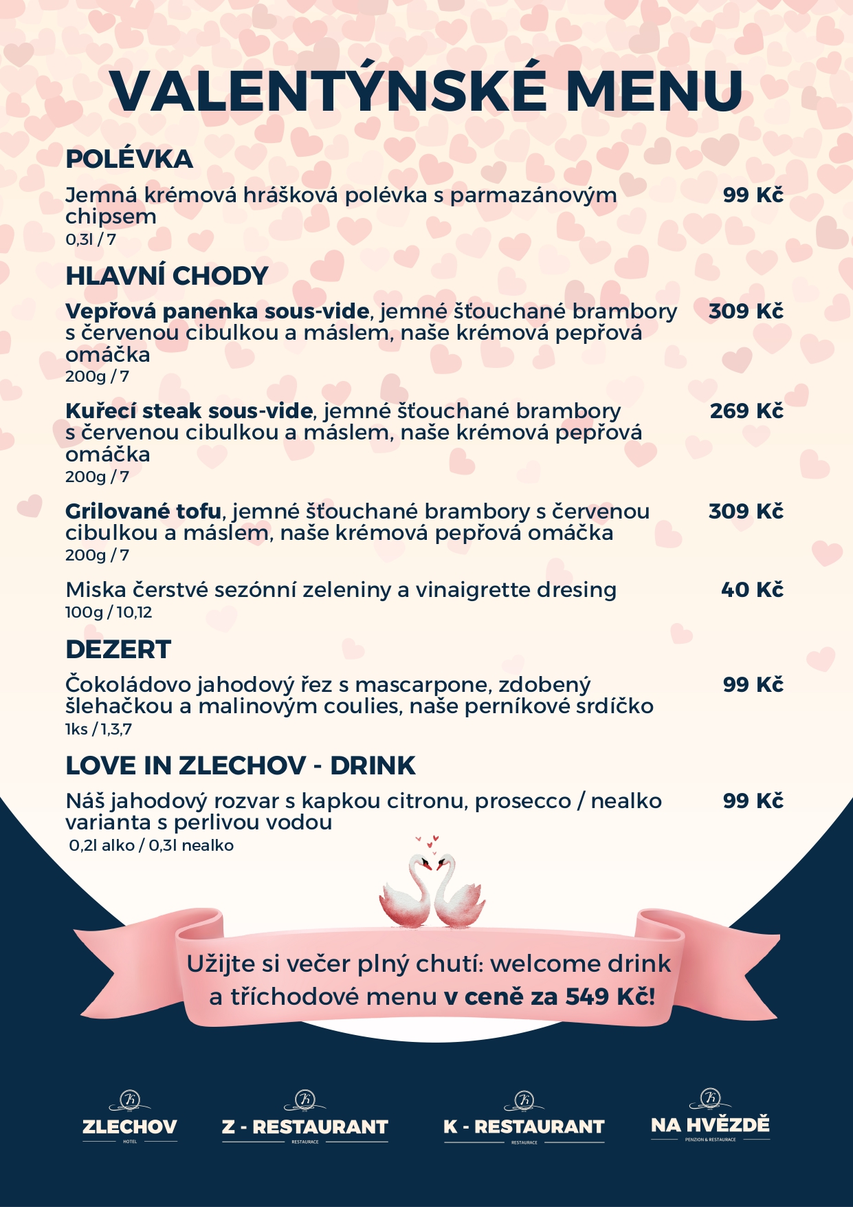 Valentýn je ideální příležitost zpomalit, užít si společné chvíle a nechat se hýčkat. Připravili jsme pro Vás speciální valentýnské menu, které spojuje jemné chutě, poctivé suroviny a kapku romantiky. Přijďte si vychutnat večer, na který se nezapomíná.