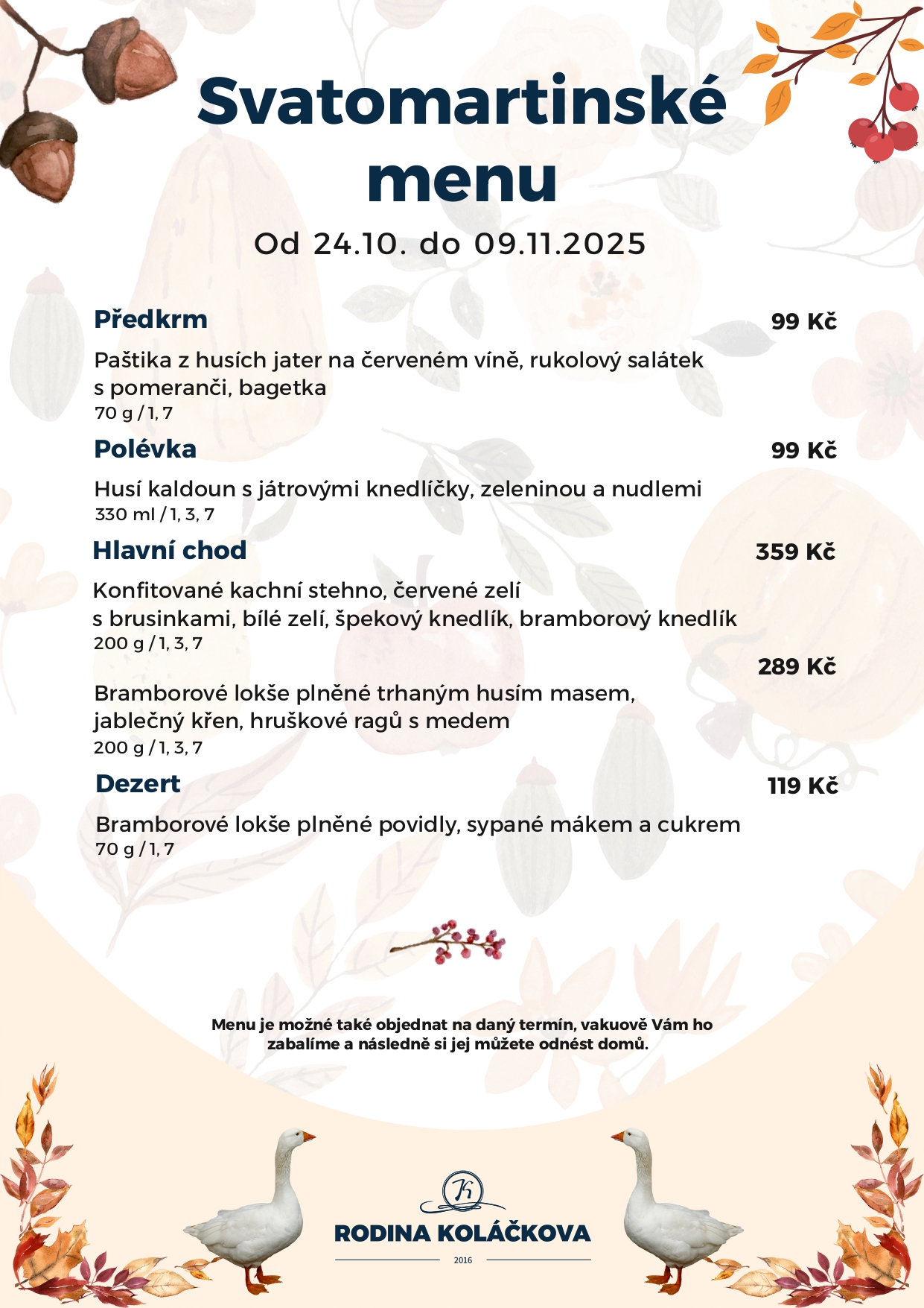 Menu je podáváno v termínu od 24.10. do 09.11.2025. Přijďte si užít svatomartinské menu a nechte se unést lahodnými kombinacemi chutí, které jsme pro Vás s láskou připravili.