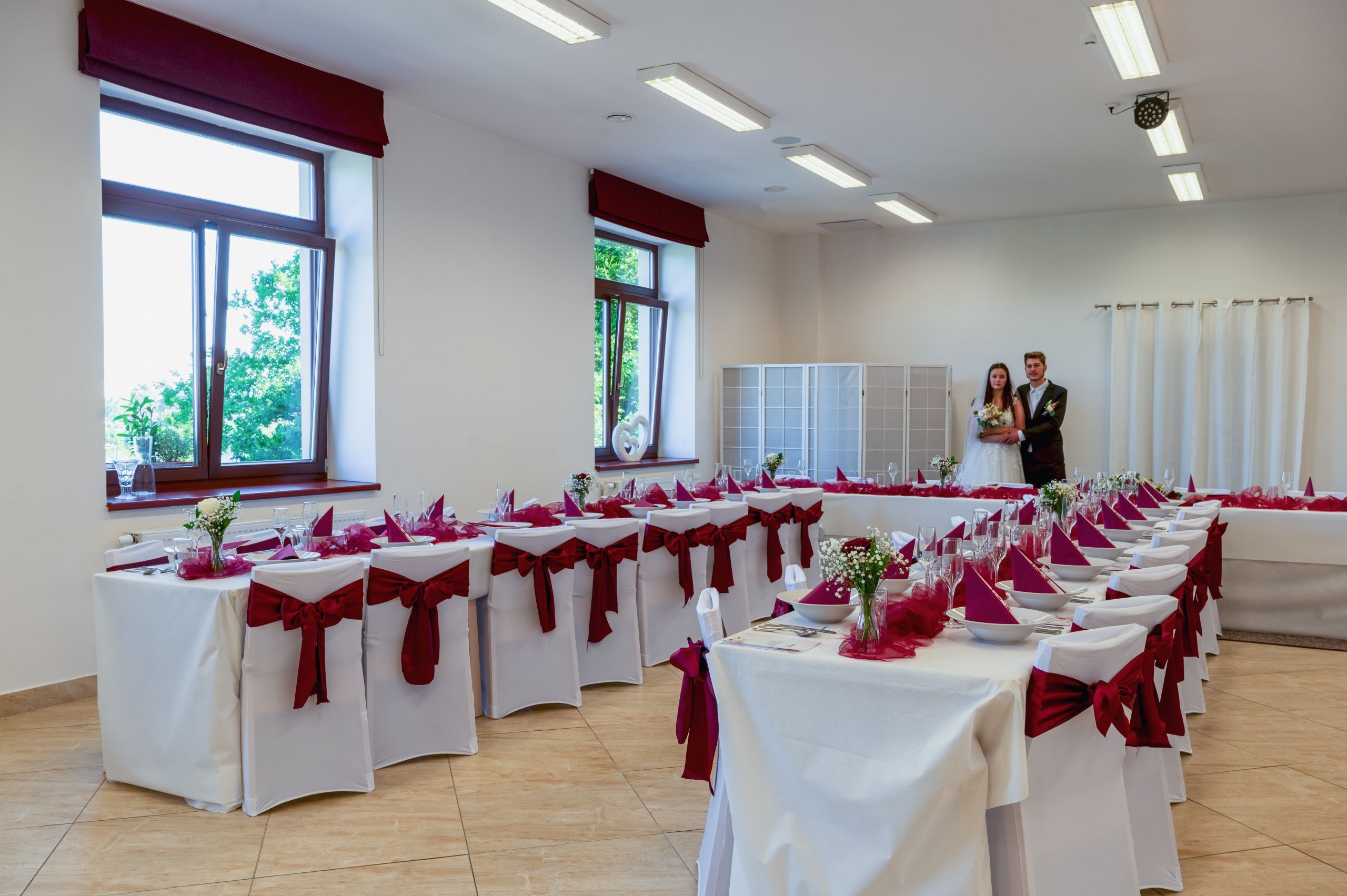 - Rozmístění stolů diskutujeme vždy se zákazníky. Sami si určíte, kde budete chtít umístit svatební tabuli, rautové stoly, stůl na dary, případný fotokoutek, místo pro živou kapelu či DJ atd.